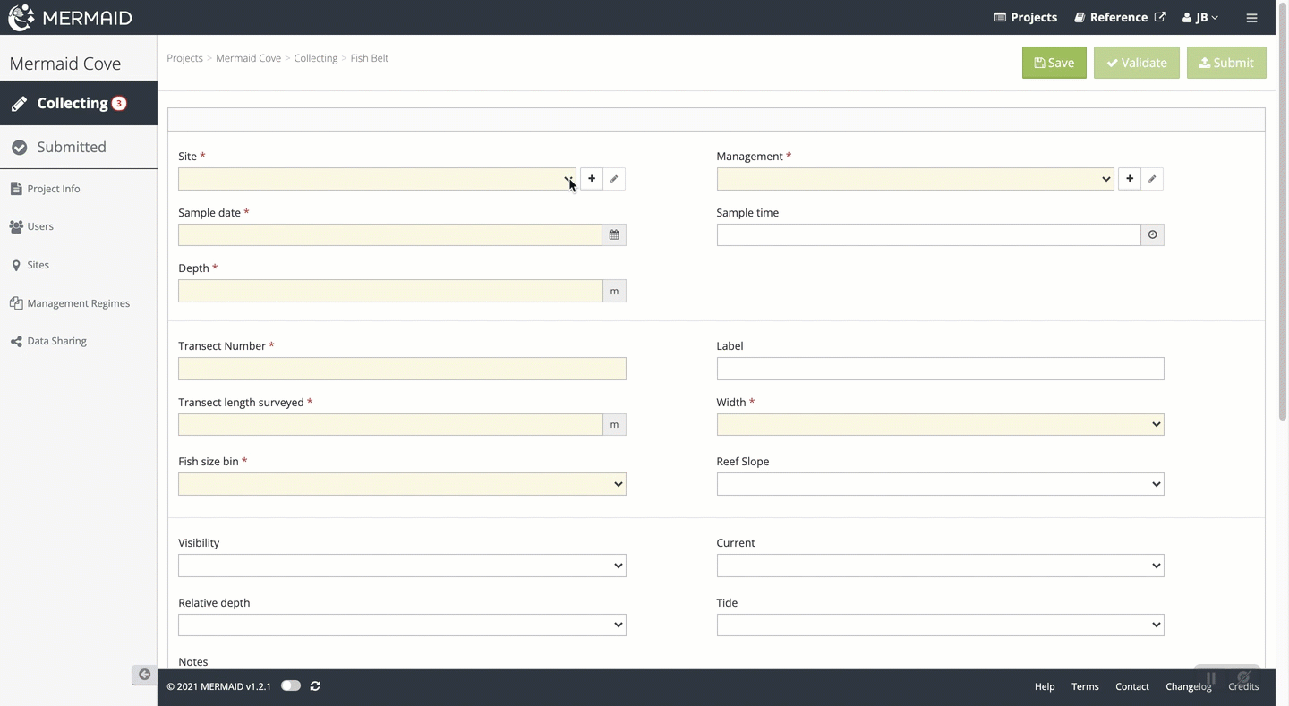 When online, you can then proceed to validating and submitting the transect. Offline, only the ‘Save’ button will appear.