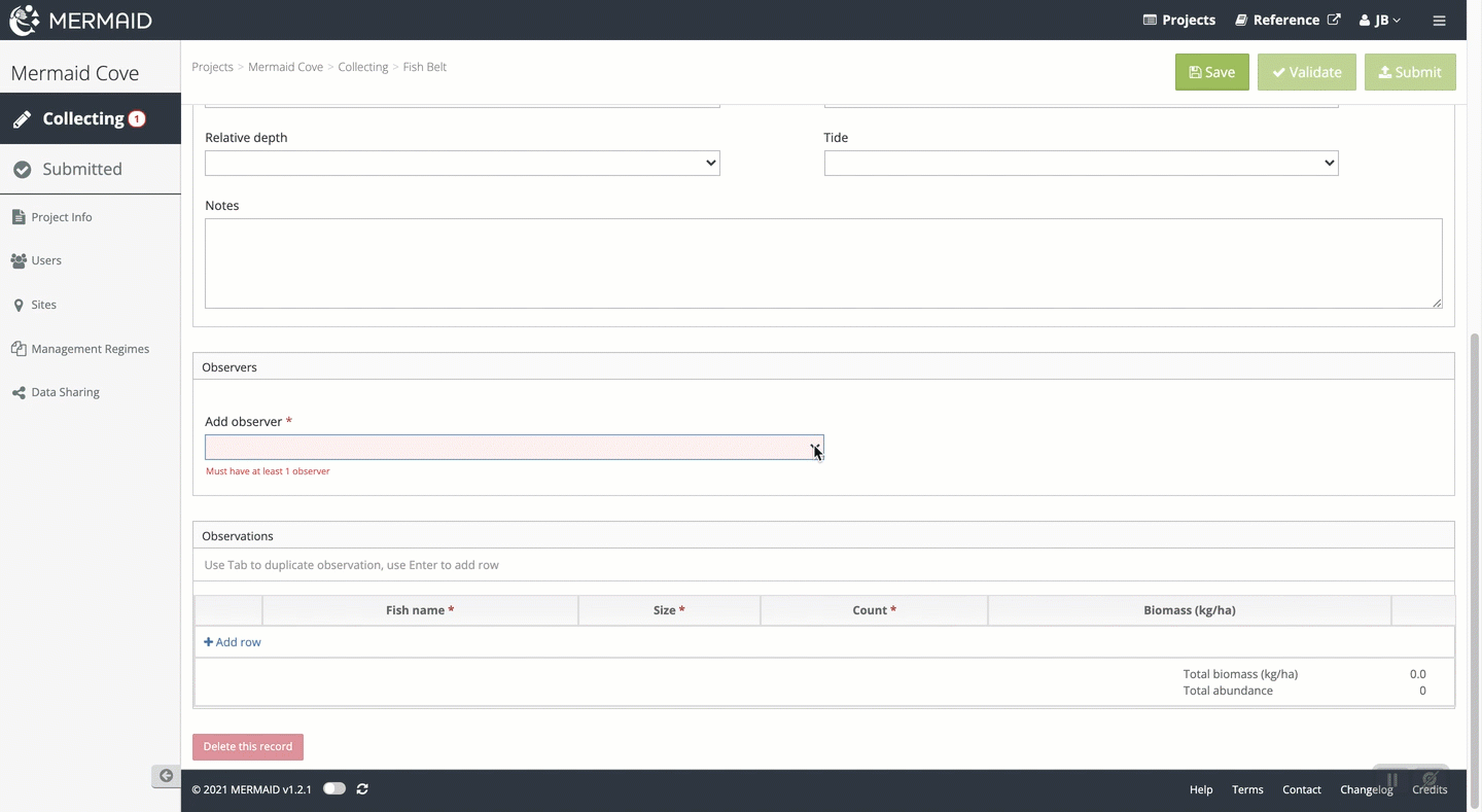 If you wish to delete a transect, click the "delete this record" button at the bottom of any transect page. This will permanently remove the record and its observations from MERMAID, so be sure that you want to remove it.