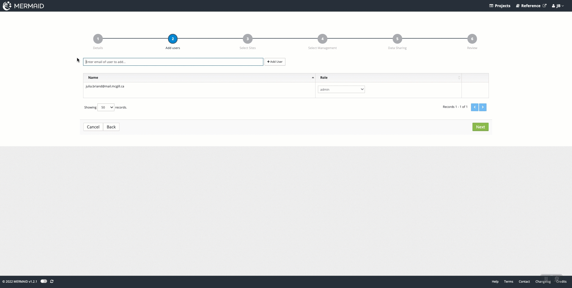Enter the email addresses for users involved in the project and select their roles. All users must be signed up for a MERMAID account before they can be added to a project.