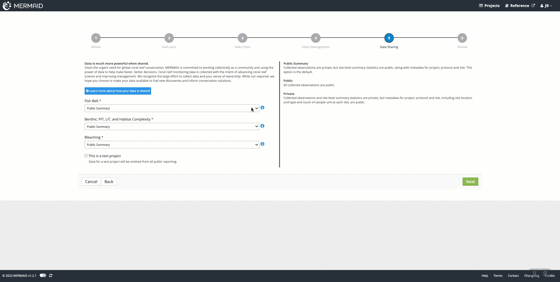 Choosing a data policy for your project determines how much of your project’s data can be shared with other users to facilitate global collaboration and understanding of coral reef health via future global dashboard features in MERMAID. It can be chosen for fish belt data and for benthic data, which can have different levels of sharing. Your data policy level can be changed at any time after creating a project.