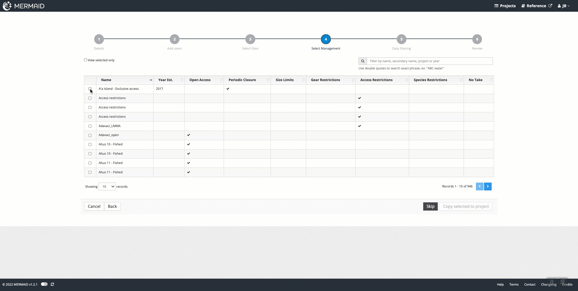 This is an optional step that allows you to choose from management types that are already in the MERMAID system.
