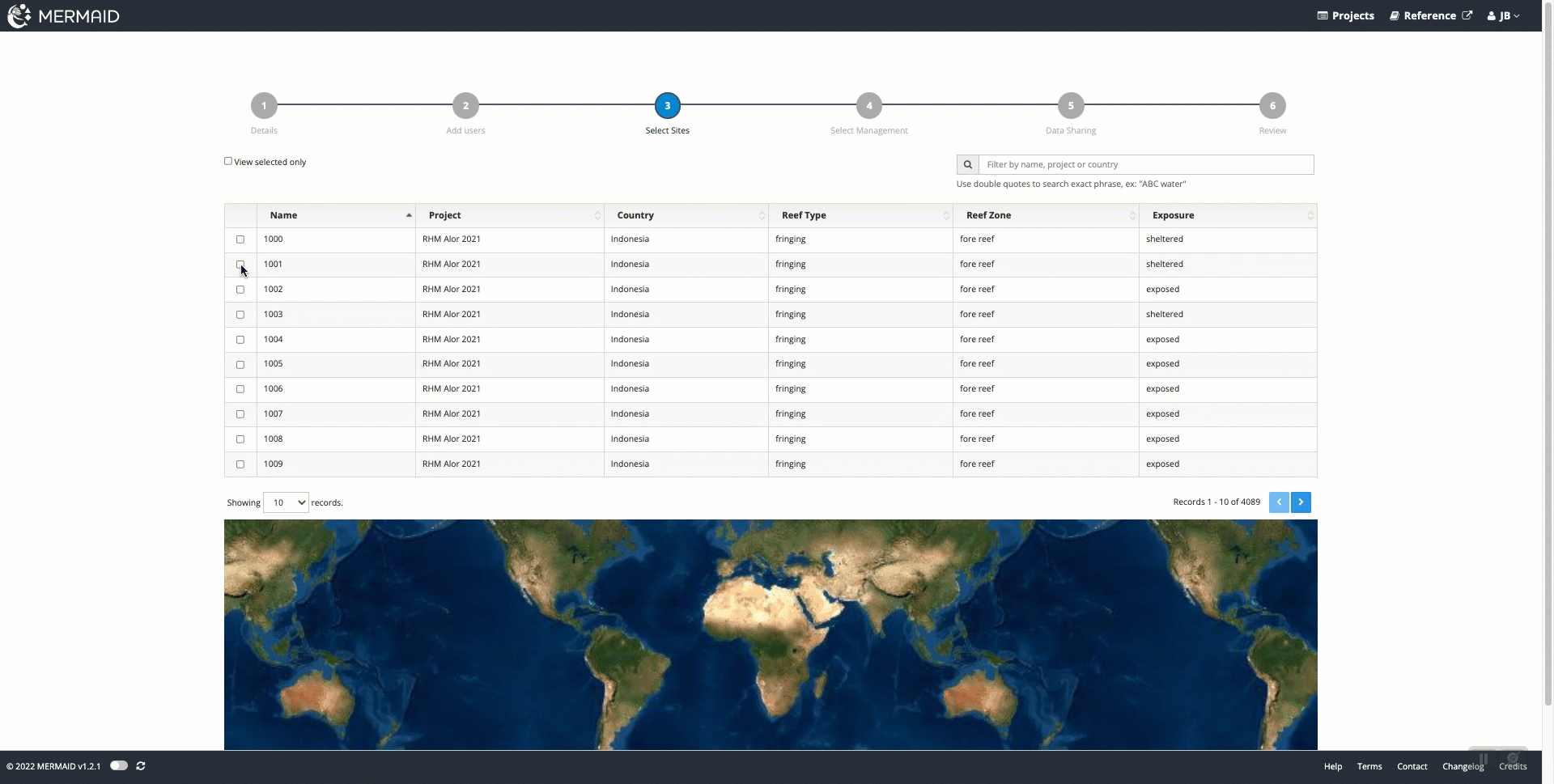 This is an optional step that allows you to choose from sites that are already in the MERMAID system. These may be sites that you or your organization are monitoring and have used before in previous surveys.