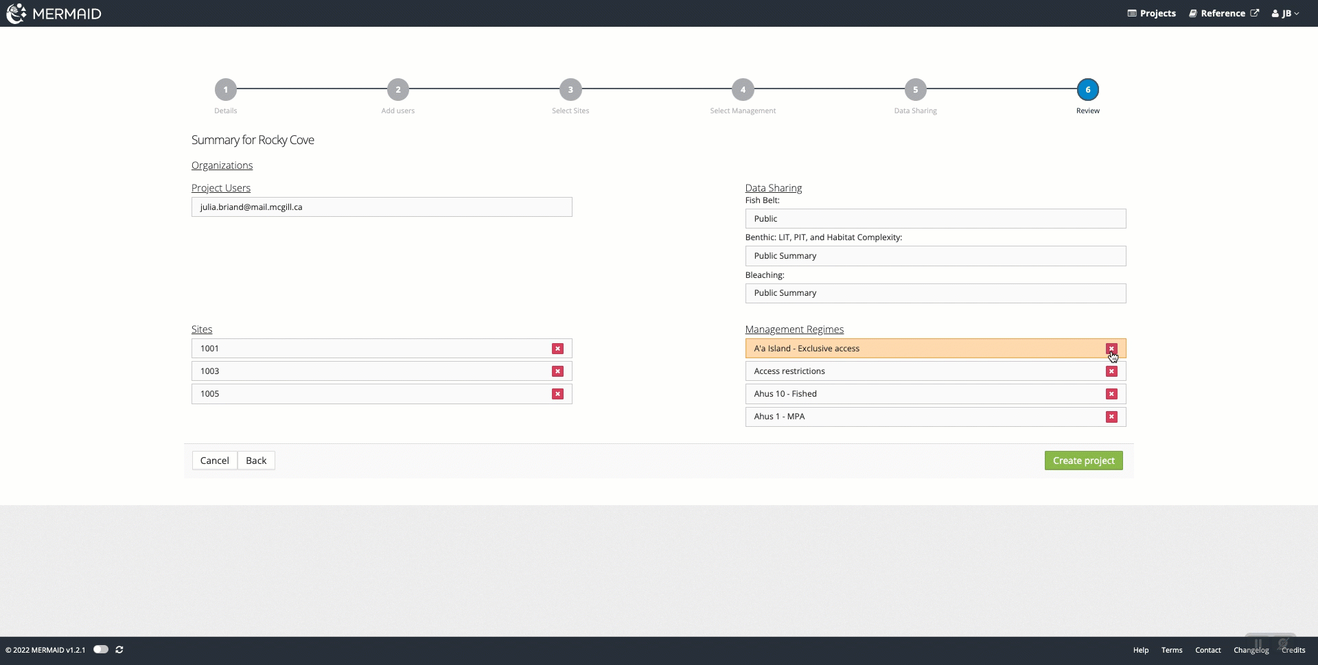 Review the summary of all the users, sites, management regimes, and data sharing that you selected for your project.